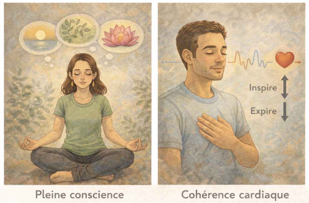 Parallèlement, je suggère différents outils de relaxation et de régulation émotionnelle tels que « la Pleine Conscience », « la Cohérence cardiaque » et la « Méthode de relaxation de Jacobson ». Cette dernière établit un lien entre les tensions musculaires et l’état de stress.